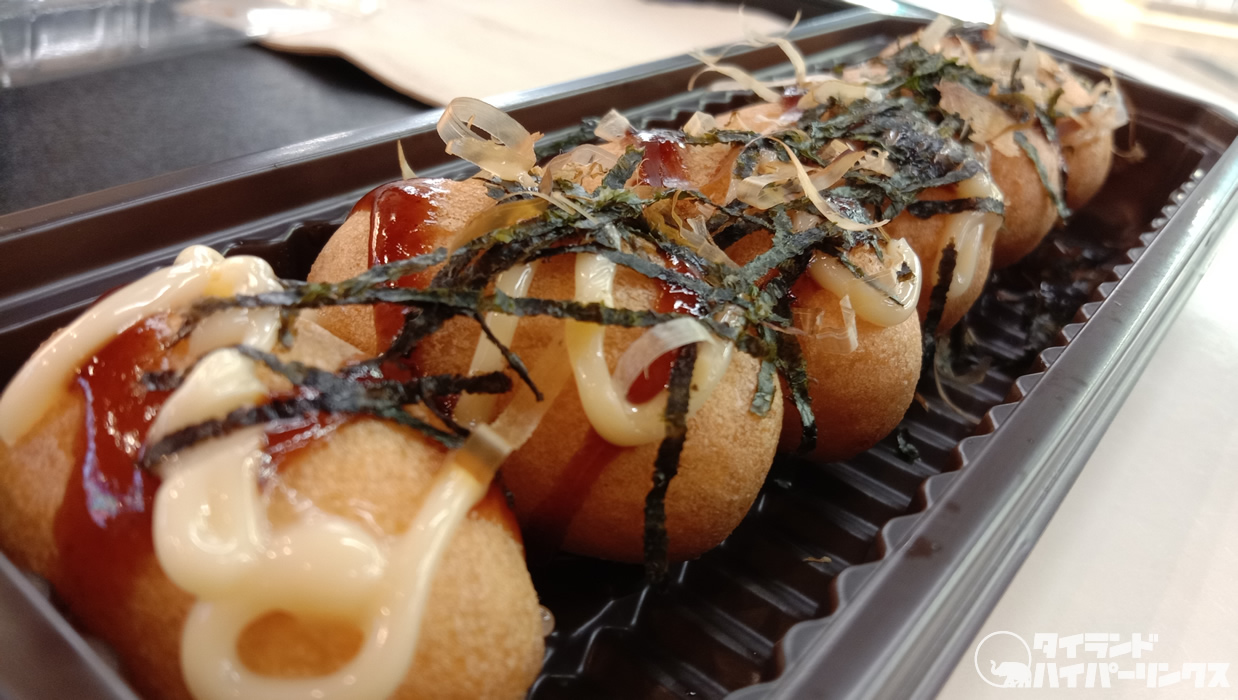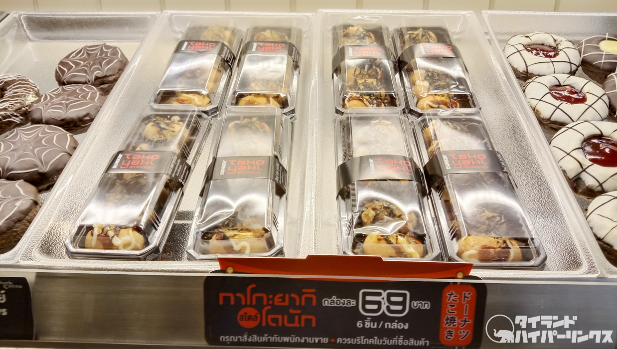 なるほど「たこ焼き」風のドーナッツですか。6個入りがパックになって69バーツで販売されています。