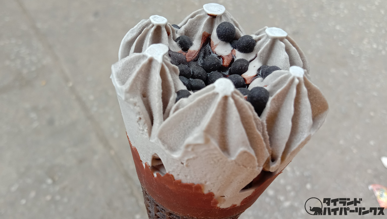 これが「ブラック焙じ茶」で価格は1つ30バーツ。黒いアイスクリームに、小さな黒いクッキーが乗っています。