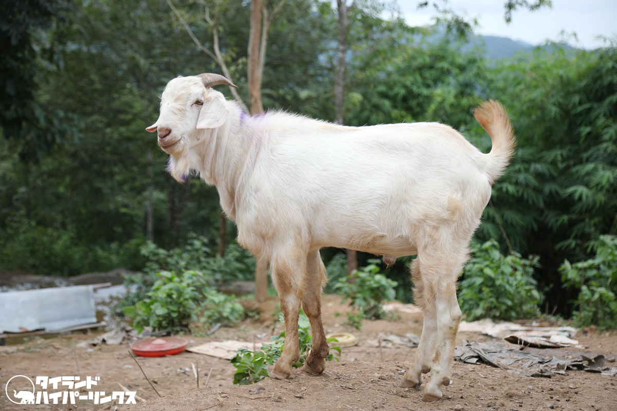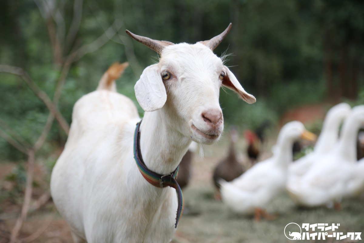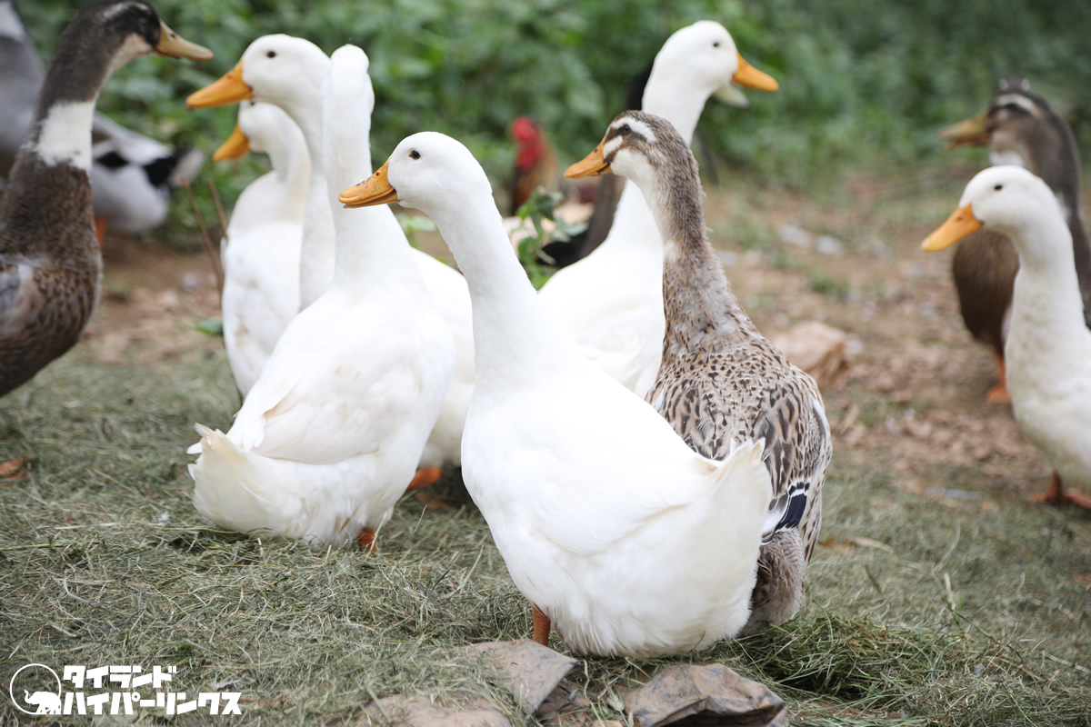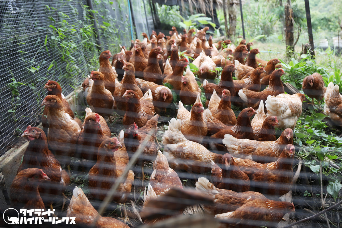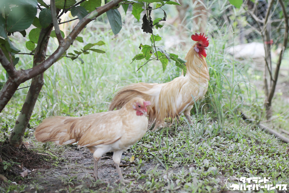 「プーチャイ」のオーガニックファームでは、たくさんの動物達が暮らしています。最初に案内された小屋にいた、たくさんの鳥たち。レストランの食材はオーガニックファームのものも使われていると聞いていたので、スタッフのベンさんに「この鳥は食べるんですか?」と聞くと、「これは飼ってるんですよ。」とのことでした(笑)。