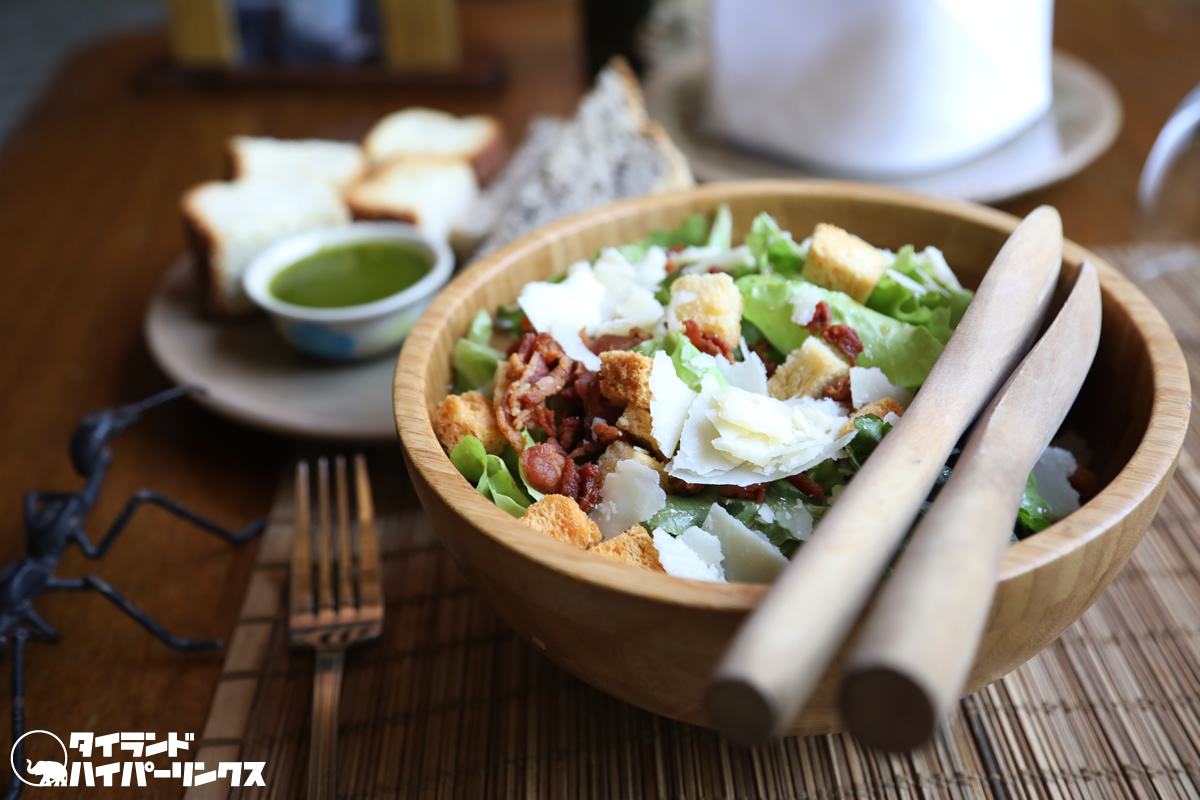 そしてこちらがレストランのシグネチャーメニューのひとつである「プーチャイサイ・サラダ」です。価格はSサイズが290バーツ、Lサイズが450バーツです。ぜひお試しを。