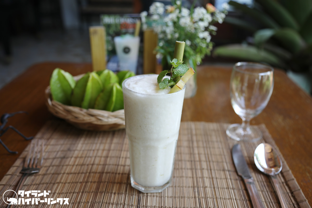 スターフルーツで出来たスムージーもオススメだそうですよ。価格は150バーツ。 建物や調度品など多くで竹が使われている「プーチャイサイ」ですので、ストローもエコロジーな竹製です!レモングラスのストローは見たことがありましたが、竹製ははじめて見ました!