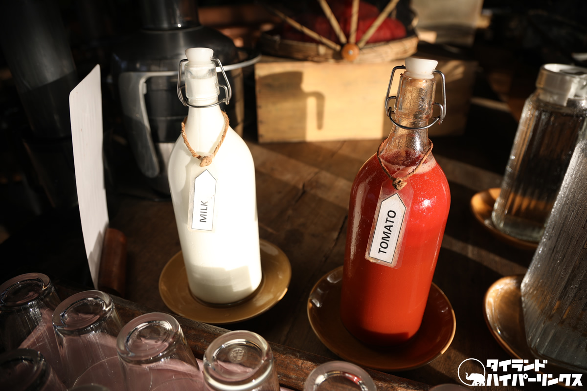 牛乳とトマトジュースとの紅白のコンストラクションが実に鮮やかです。
