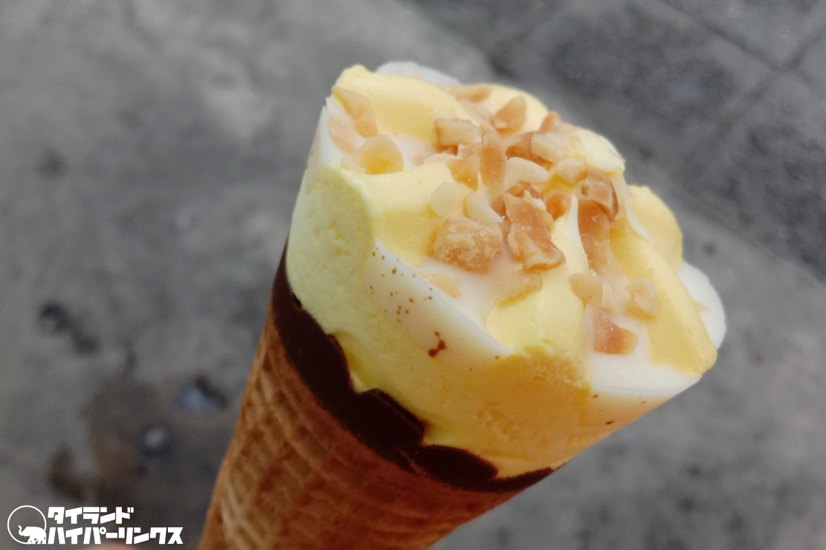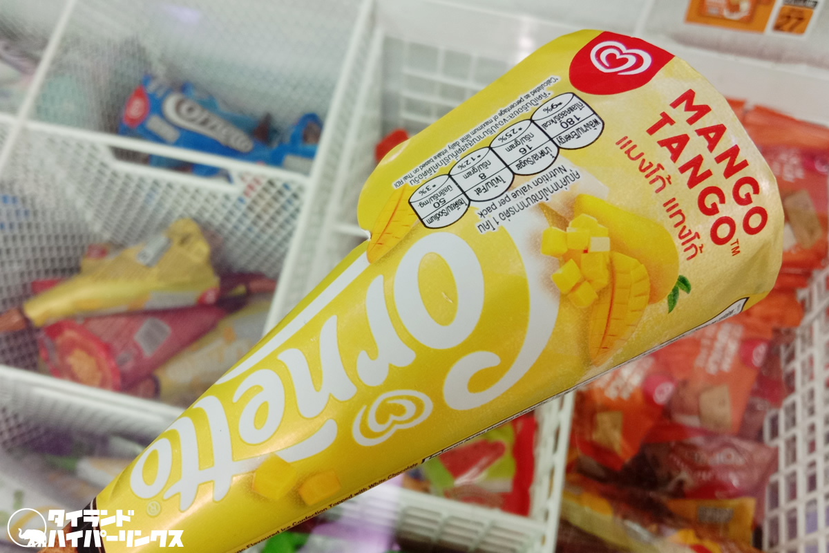 焙じ茶やらタピオカやら、最近は随分と攻め気味のアイスを発売している印象のあるWALL’s。そのWALL’sのコーンアイス「Cornetto」で、初めて見る商品を発見しました。それが「MANGO TANGO」。価格は1つ20バーツ。