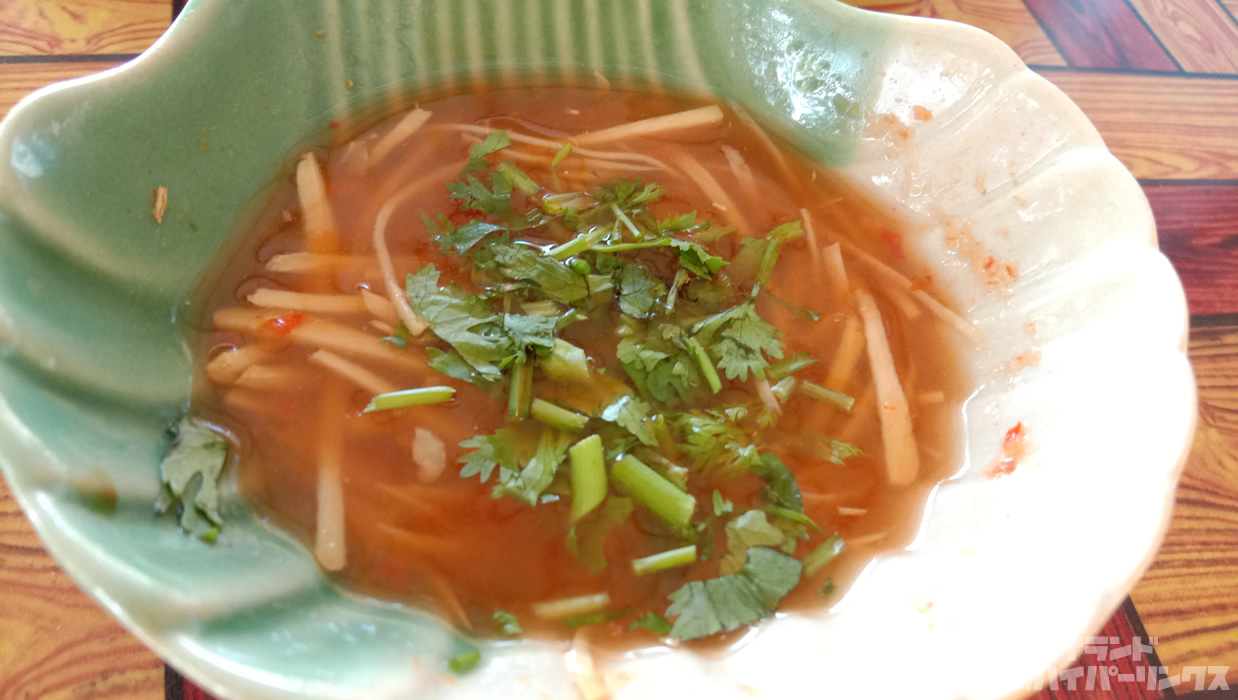 タレは醤油ベースでなく、こんな感じ。チリソース(?)に生姜とパクチー。