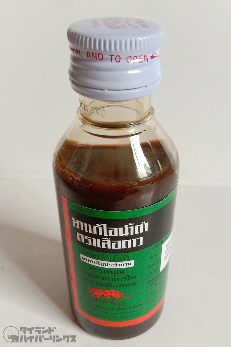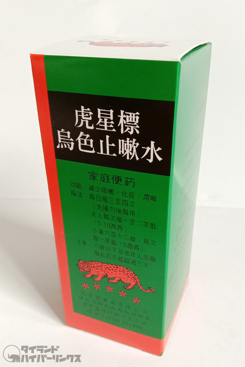 昨晩から咳が止まらず、なかなか寝付けず・・・。そこでコンビニで購入した咳止めシロップがこの「ยาแก้ไอน้ำดำ ตราเสือดาว(ヤーケーアイナムダム )」、漢字では「虎星標 烏色止嗽水」。説明が漢字で書かれているので、咳止めだというのはわかりますね。60mlで価格は21バーツ。