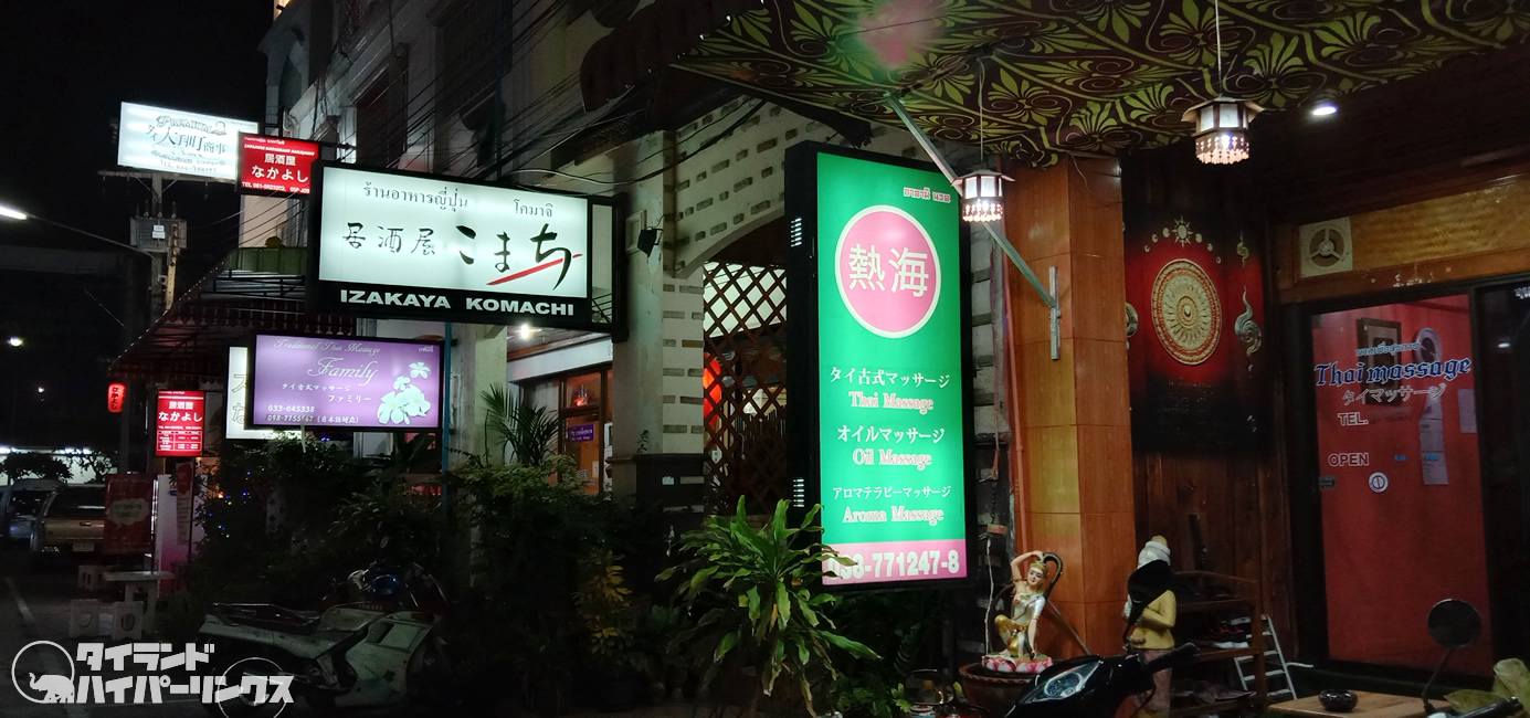 タイ式マッサージ屋さんも日本語で看板が出ています。