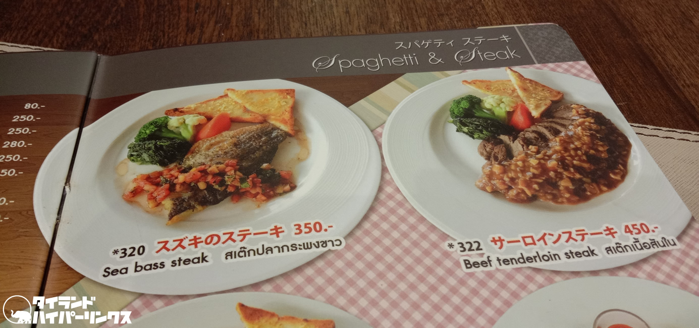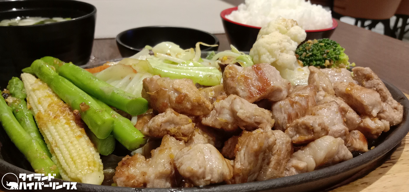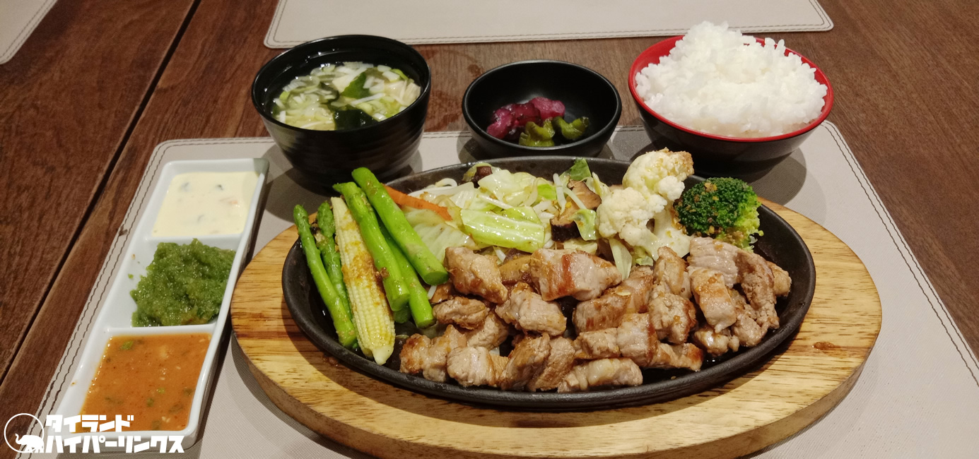 そんな「バルコニー・シーサイド」で注文したのが、250バーツの「豚肉ステーキ」セット。いまなら日本円で850円くらいでしょうか。それがこのボリューム!