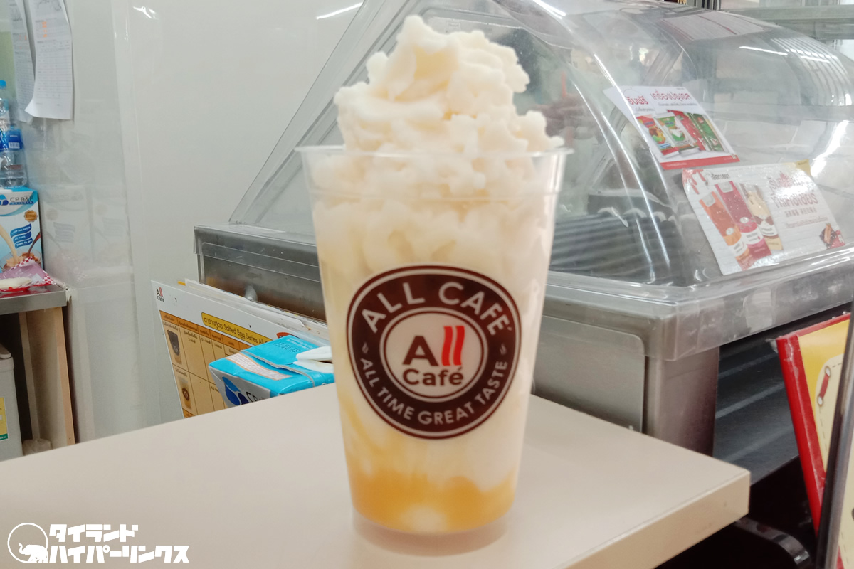 「カイケムノムソートパン(ไข่เค็มนมสดปั่น)」、英語では「Salted Egg Milk Frappe」は、ミルクシェイクにカイケムソースを加えたもの。カップの内側にカイケムソースを塗って、そこにミルクシェイクを入れるのです。