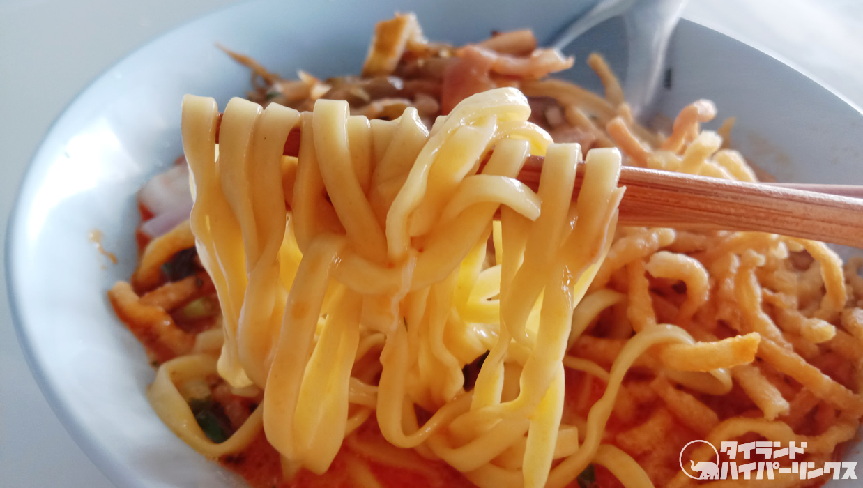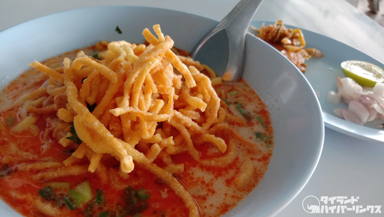 北タイの名物料理といえば、やはりカレー麺・カオソーイですね。カレー風味のスープ麺に、トッピングとして更に揚げ麺が乗っているというアレです。