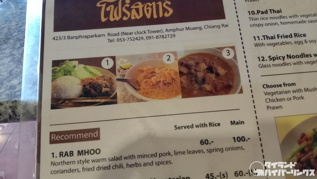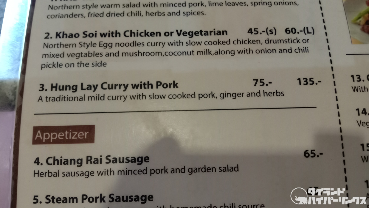ここでのオススメメニューは「ラーブムー」、「カオソーイ」、そして「ゲーンハンレー」。