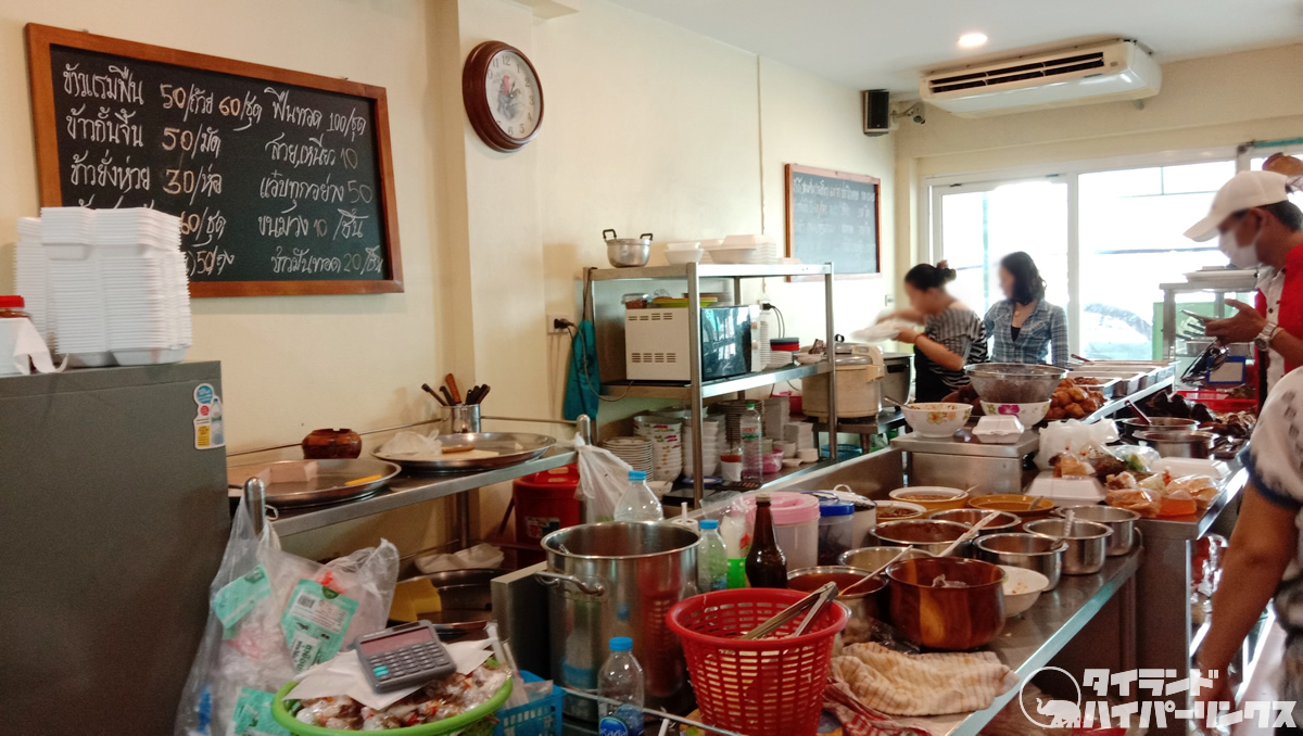 エアコンの効いた店内では北タイ料理、チェントン料理が並んでいます。テーブルに着く前に(またはテーブルに着いた後に)料理はここでオーダーしてください。