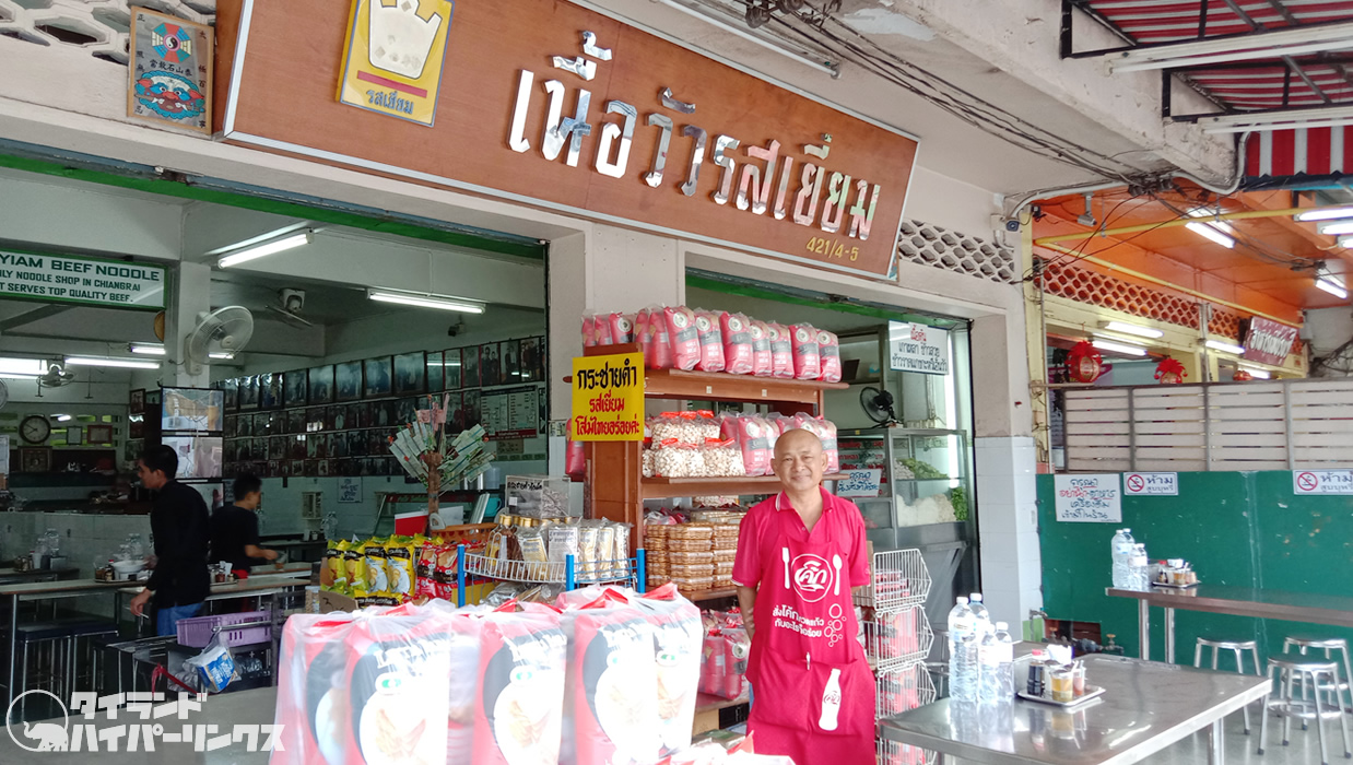 北タイの街・チェンライで早朝の旨いもの探し。この日に朝食で訪れたのは「ヌアウアロットイアム(เนื้อวัวรสเยี่ยม )」。黄金の時計塔の西側に並ぶ、いくつかの食堂の中の1つのお店です。