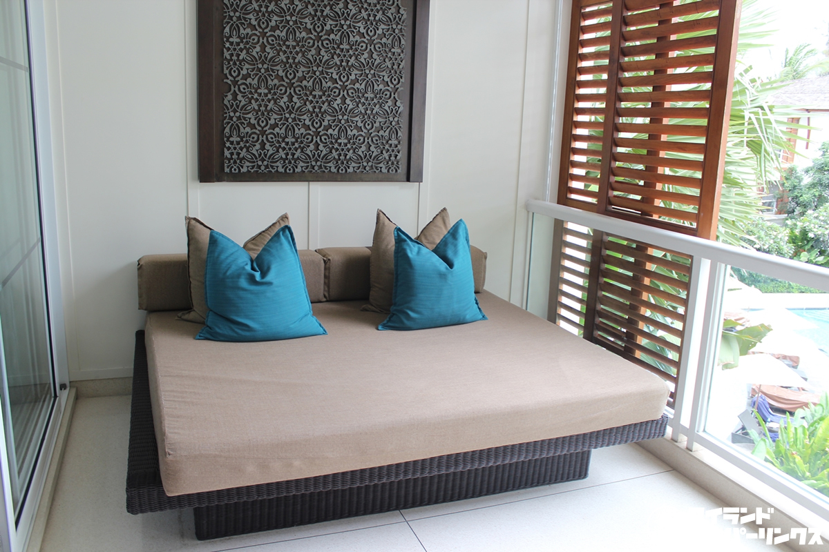 ベランダからホテル自慢のプールが見下ろせます。ここにもファンが付いているので、ソファに座ってノンビリするのもグッドです。プライバシーが欲しい時には自動式のカーテンを下せば、外から見えません。