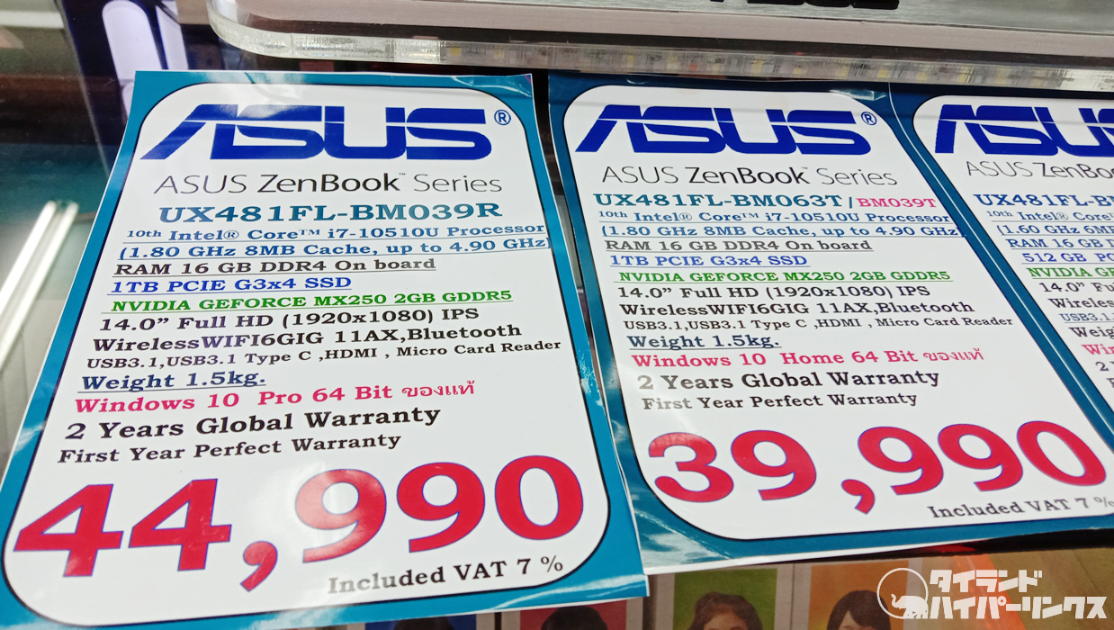 ちなみに上の写真は、右も左も同じ機種、同じスペックですが、Windows 10 ProかWindows 10 Home Single Languageかの違いで、5000バーツの価格差が付いています。自分でアップグレードすれば、これよりちょっと安いみたいですけどね。