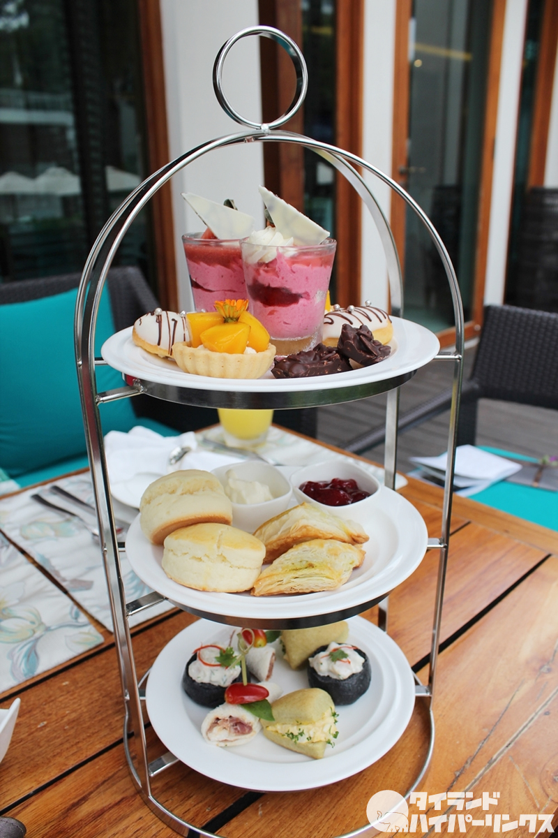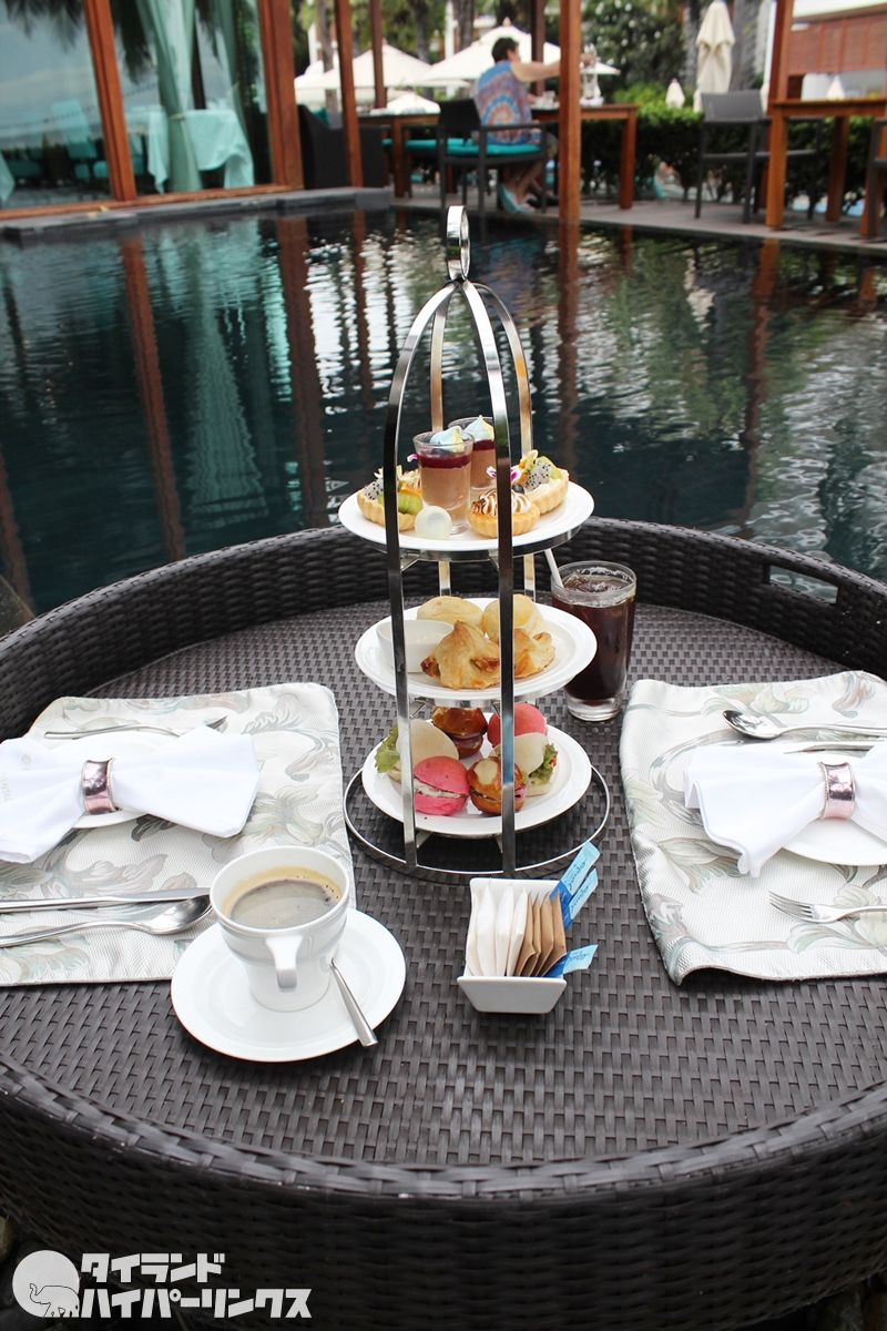 午後3~5時の間、アフターヌーン・ティーのセットも提供されます。内容は日替わりです。こんな風にラウンジに隣接した専用プールの中で、アフタヌーンティーを頂くことも。これはSNS映えしますね~。