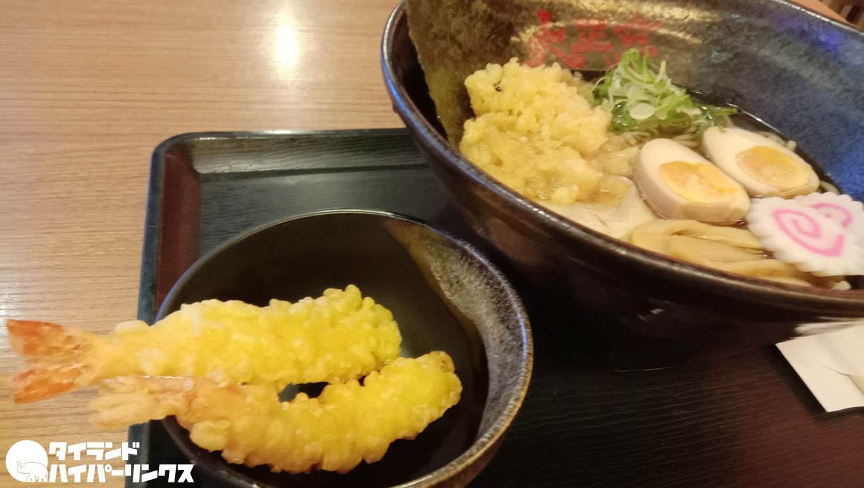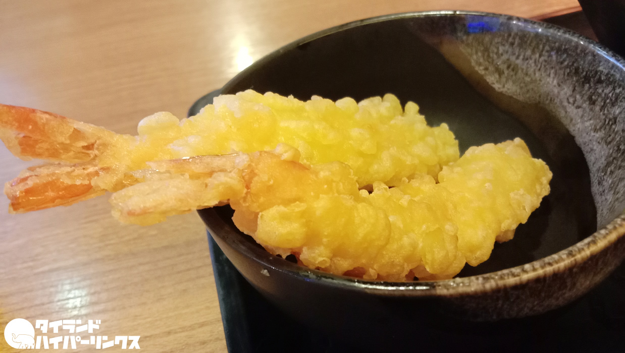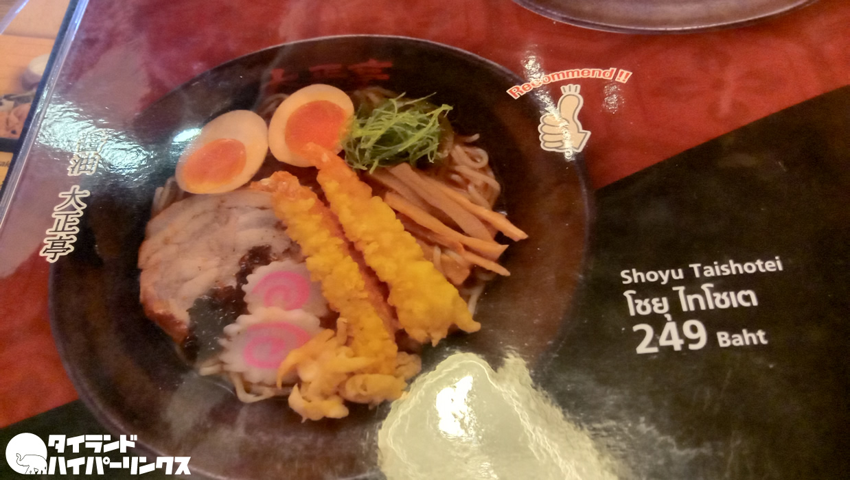 そんな中でオーダーしたのが、「大正亭」の名がつけられた「醤油 大正亭」。エビの天ぷらの乗ったオススメのメニューです。ちなみに価格は249バーツですが、サービス料と税金が別途かかります。