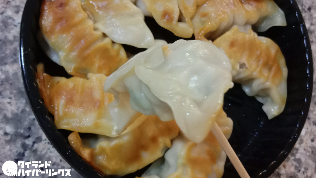 ご覧の通り、中身はボリュームタップリで。なんと10個入り。これで69バーツとは日本式のラーメン屋さんの餃子はもちろん、中華料理店の餃子よりも安いんじゃないですか?
