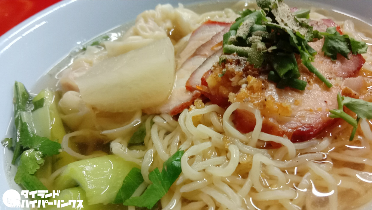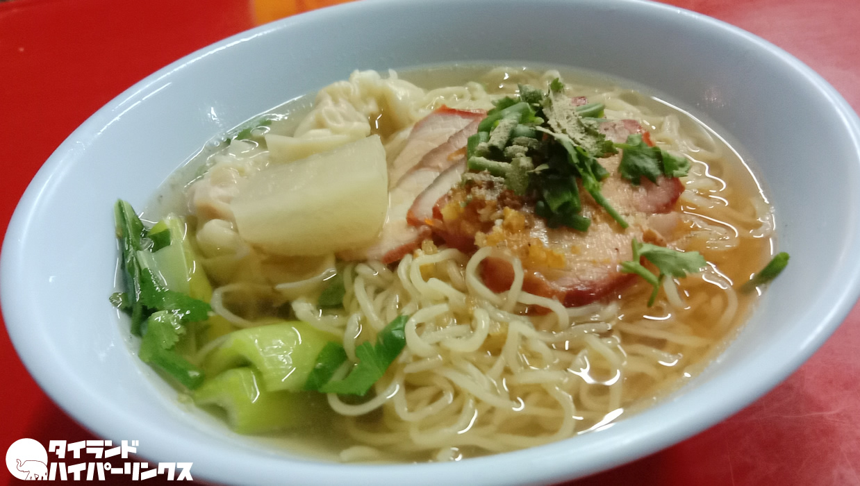メニューに汁なしラーメンのバミーヘーンはありますが、つけ麺はないので、普通のラーメンをオーダー。ワンタン入りのバミーナム・キアオです。