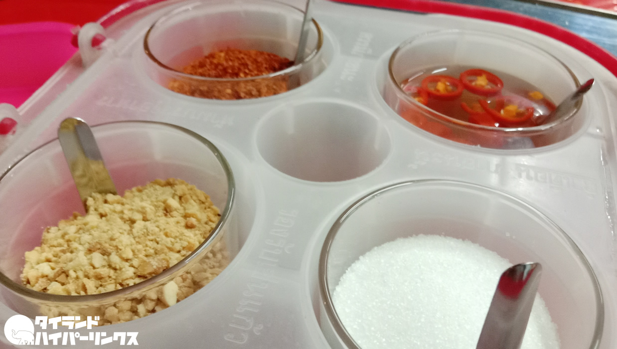 スープにしっかり味はついていますが、自分の好みでアレンジするのがタイ式。テーブルには砂糖、唐辛子入りのお酢、唐辛子、砕いたピーナッツ、そしてナンプラーが置いてあります。