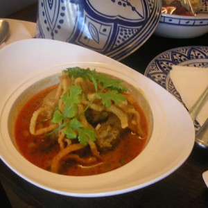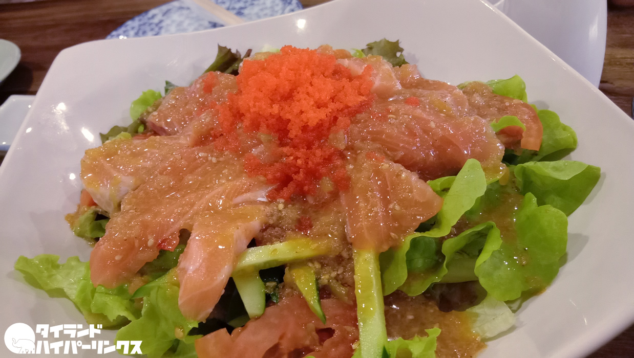 食事は終えていたので、日本酒を飲みながらつまむ程度。まずは「サーモンサラダ」。サーモンたっぷりで200バーツとは結構お得。味も良いです。