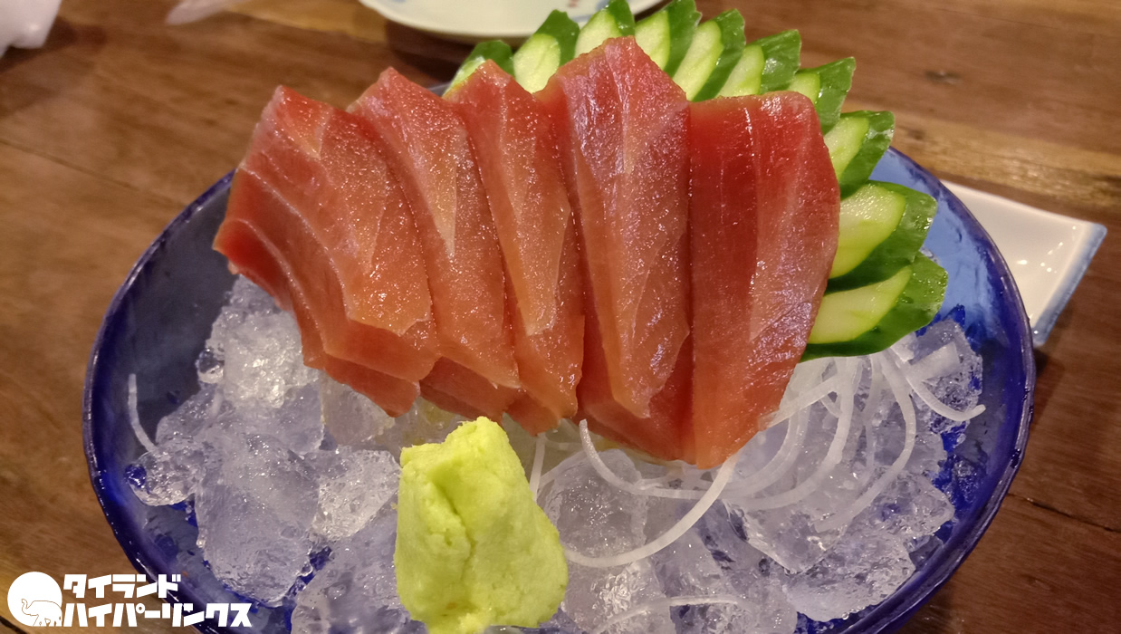 続いてマグロの刺し身。これが320バーツです。とにかく切り身が分厚いんですよ。食べごたえもあるし、美味しいマグロですね。