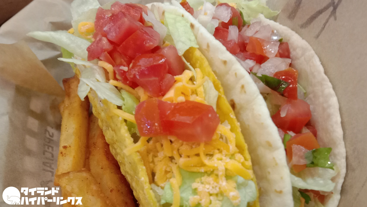 この日オーダーしたのは、「2 TACOS SUPREME COMBO」(189バーツ)と「2 KICKIN’ CHICKEN TACOS COMBO」(189バーツ)で、1つは店内で食べて、1つは持ち帰り。両方を食べてみたいので、店員さんにお願いして、半々にしてもらいました。