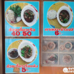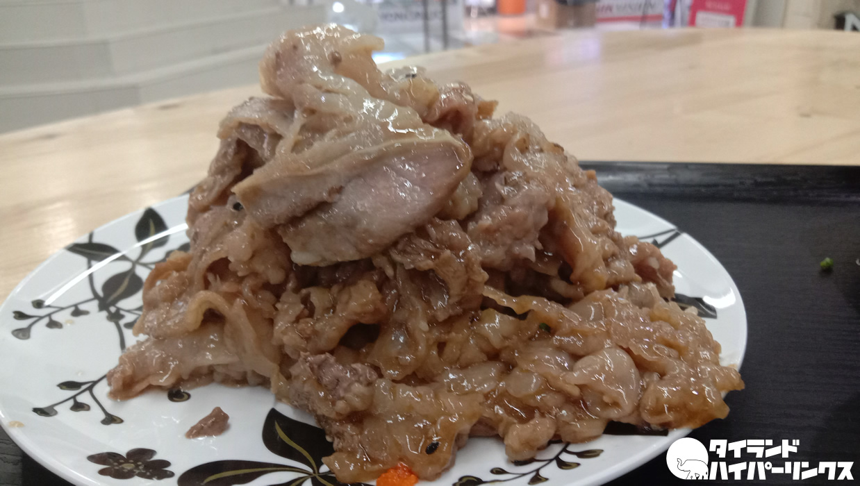 こちらがそのメニュー。山頂に温泉卵が乗ったほうが「溶岩山牛丼(ข้าวหน้าเนื้อภูเขาลาวา、カオナーヌア・プーカオラーワー)」、もう1つが「地獄山牛丼(ข้าวหน้าเนื้อภูเขานรก、カオナーヌアプーカオナロック)」。どちらもアンガス牛が400グラムも乗って、299バーツという安さです!