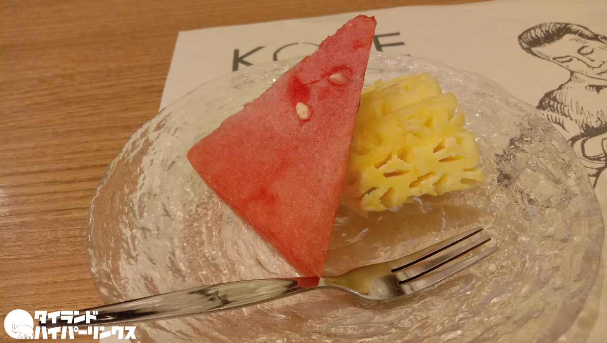 全て食べきって、お腹いっぱい。お会計をお願いすると、最後に食後のフルーツを持ってきてくれました。これで口の中もサッパリ。久々に「神戸ステーキハウス」を訪れて良かった。