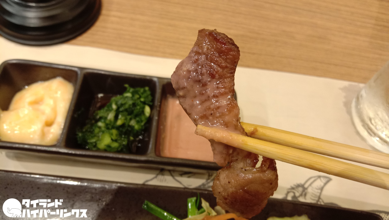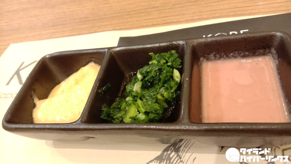 この日セントラルワールド店でオーダーしたのは、「黒豚ステーキセット」(229バーツ)。サラダとステーキのソースが最初に運ばれて来たのですが、一番右のピンクのステーキソースはなんでしょう?正解は後ほど。