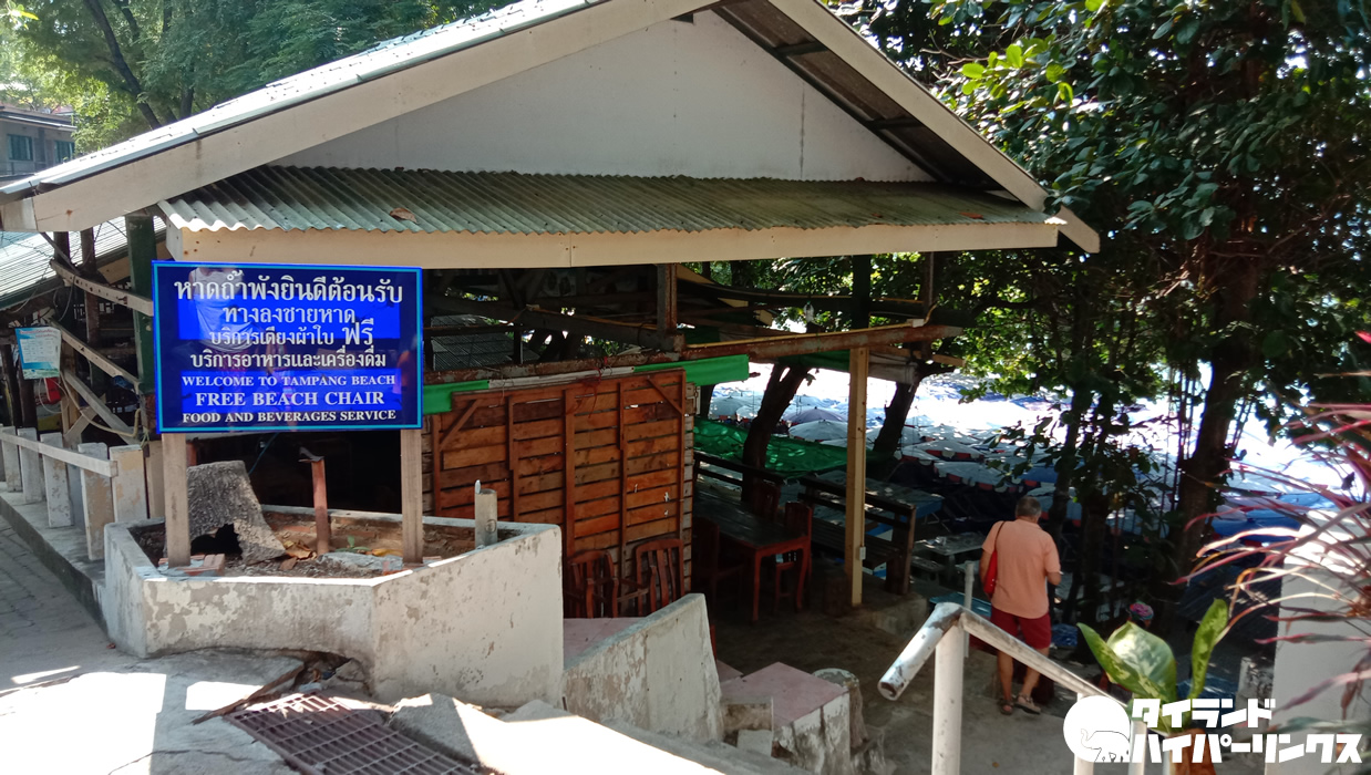 階段を降りると、そこはビーチ。看板には、「ビーチチェア無料」とありますよ!