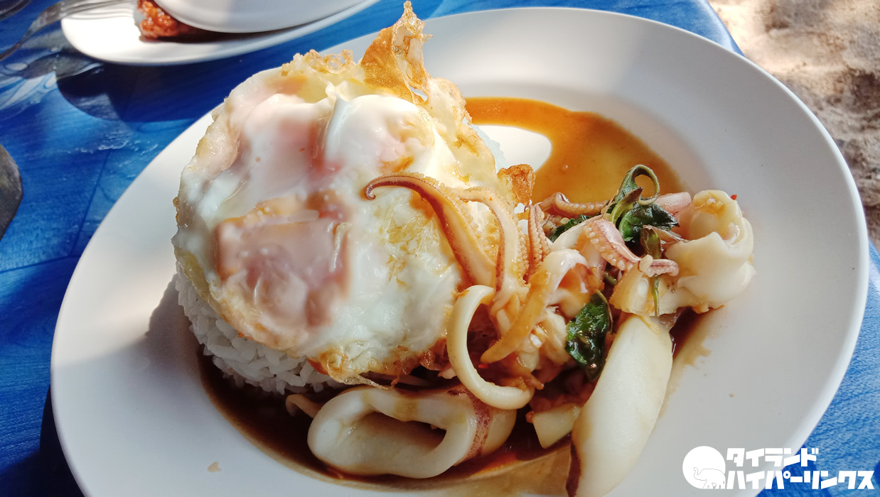 やっぱりシーフードが良いということで、目玉焼き付きの「イカのガパオライス」をオーダーしました!旨い!