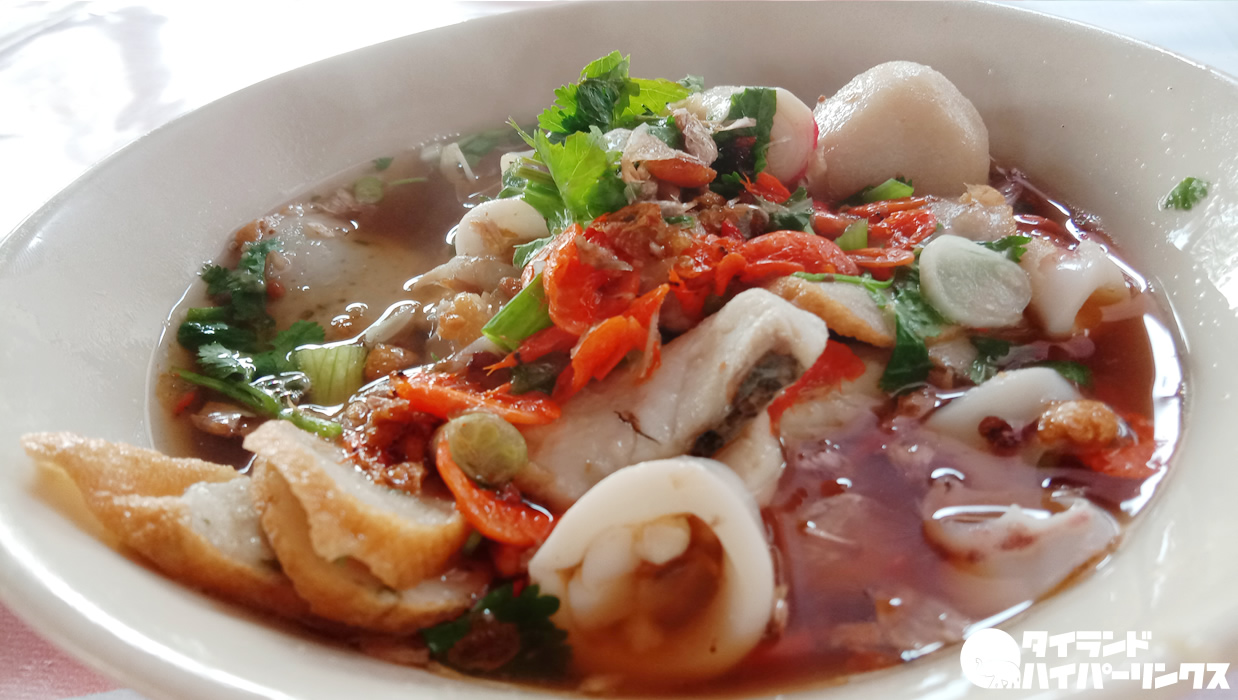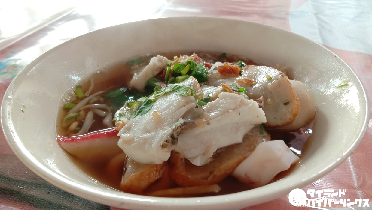 「センレックナーム(เส้นเล็กน้ำ スープありの米粉細麺)で!」とおばあちゃんにオーダーして出てきたのがこちら。魚に、魚のすり身に、イカに、小エビなどが乗った具沢山のヌードル。