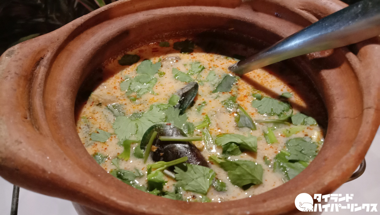 シーチャン島最後のディナーもやっぱりシーフードですね。まずは外せない「トムヤム・シーフード」(220バーツ)。ココナッツミルク入りの濃くのあるトムヤム・ナムコンというやつです。(サッパリ派はココナッツミルクなしのトムヤム・ナムサイを)