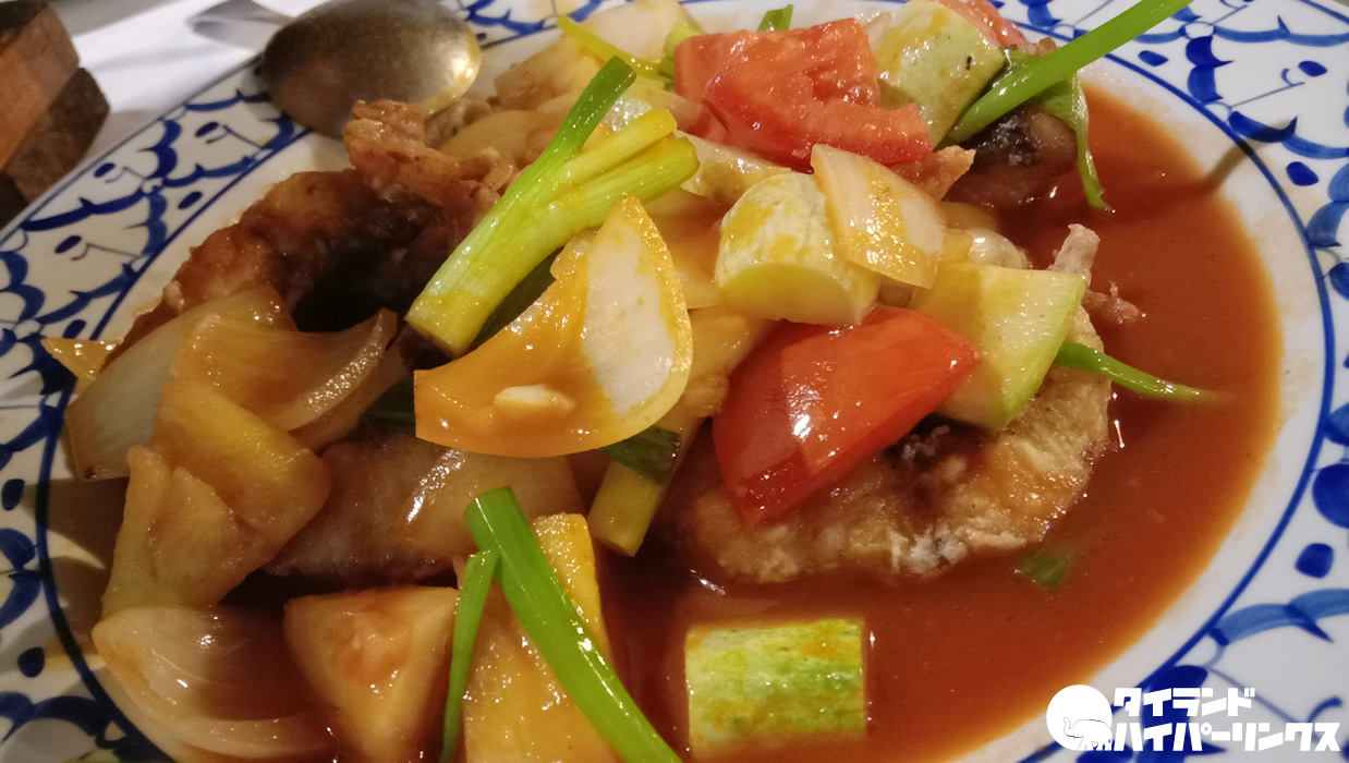 「甘酸っぱいソースのスズキ」(250バーツ)。エビチリの揚げスズキ版ですね。