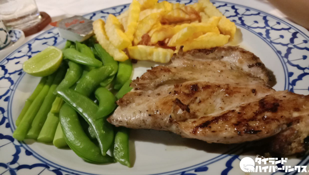 シーフードばかりがシーチャン島じゃない、ということで「グリルチキン」(280 バーツ)。