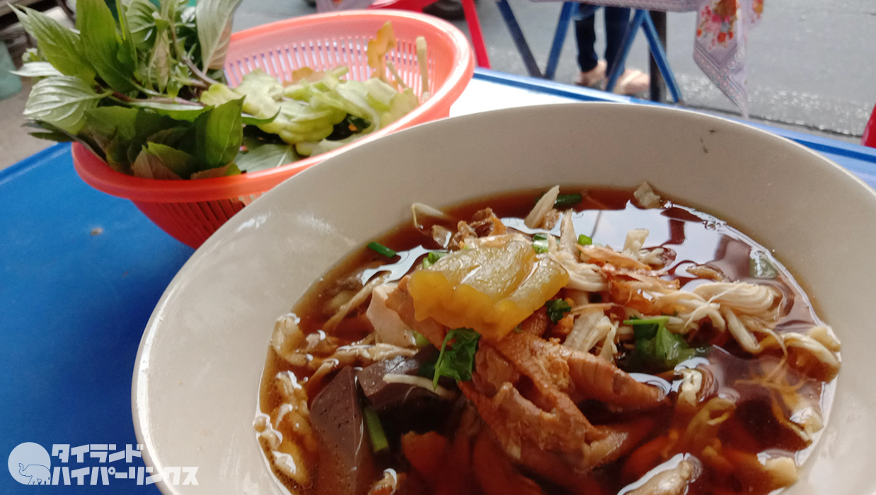 御存知の通り麺の種類は選べるので、細麺のセンレックをオーダー。それにしてもこの屋台は具沢山ですね~。鶏肉タップリに鶏の足、鶏の血、そして味の染み込んだ煮込んだ苦瓜。