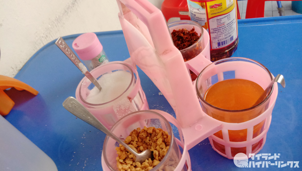 スープにはしっかり味がついていますが、自分好みにアレンジするのがタイ流。砕いたピーナッツとお酢を入れました。辛いのは嫌なので、一切唐辛子はなし。