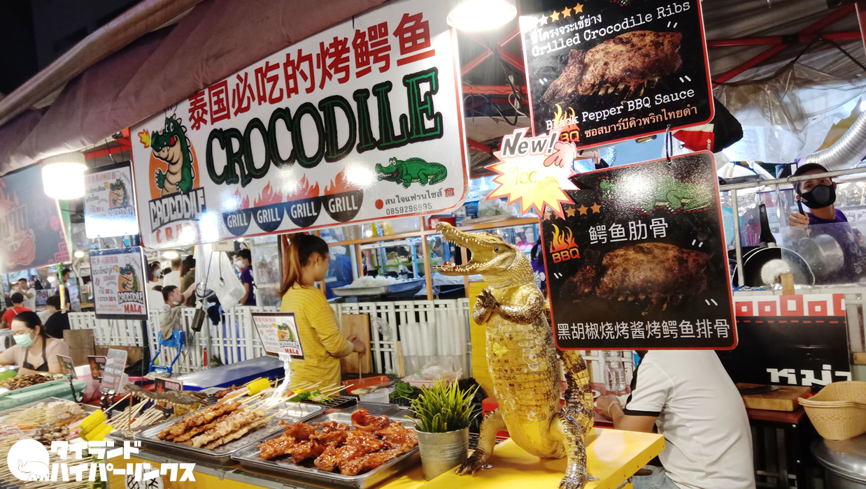 全力疾走できそうなほど空いていた「タラートロットファイ・ラチャダー」の通路をダラダラ歩いていると、ワニの人形が目に入ってきました。「もしかしてワニの肉でも売ってるの?」なんて思ったら、本当にワニ肉でした(笑)。