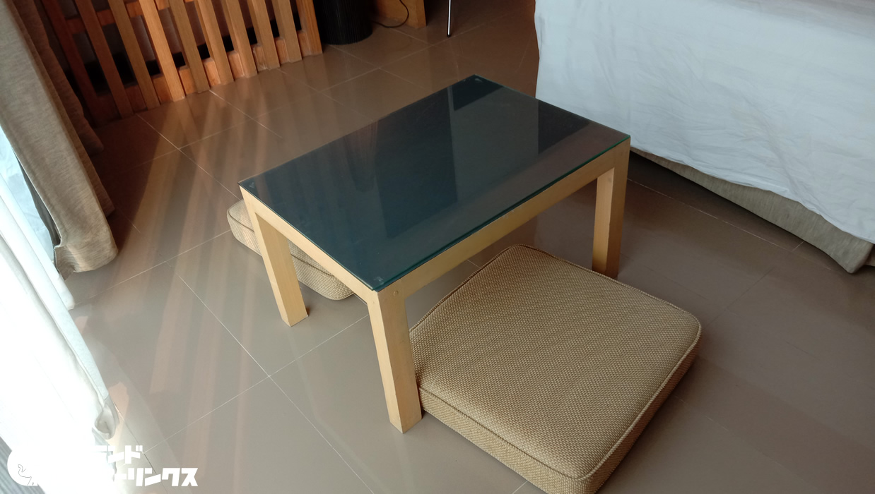 ちなみに部屋を移って、ジャパニーズルーム(禅和室)にも宿泊しましたが、何がジャパニーズなのかと思ったら、ちゃぶ台風テーブルと座布団でした。「和」の雰囲気ではない気はしますが、座布団で自宅風にリラックス(笑)。