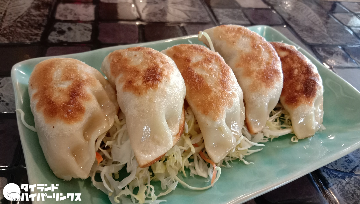 中身がタップリのボリュームのある餃子。ラーメンも餃子もなかなかの味で、これらで99バーツとは、とってもお得。日本人が続々とやって来るのも、うなずけますね。