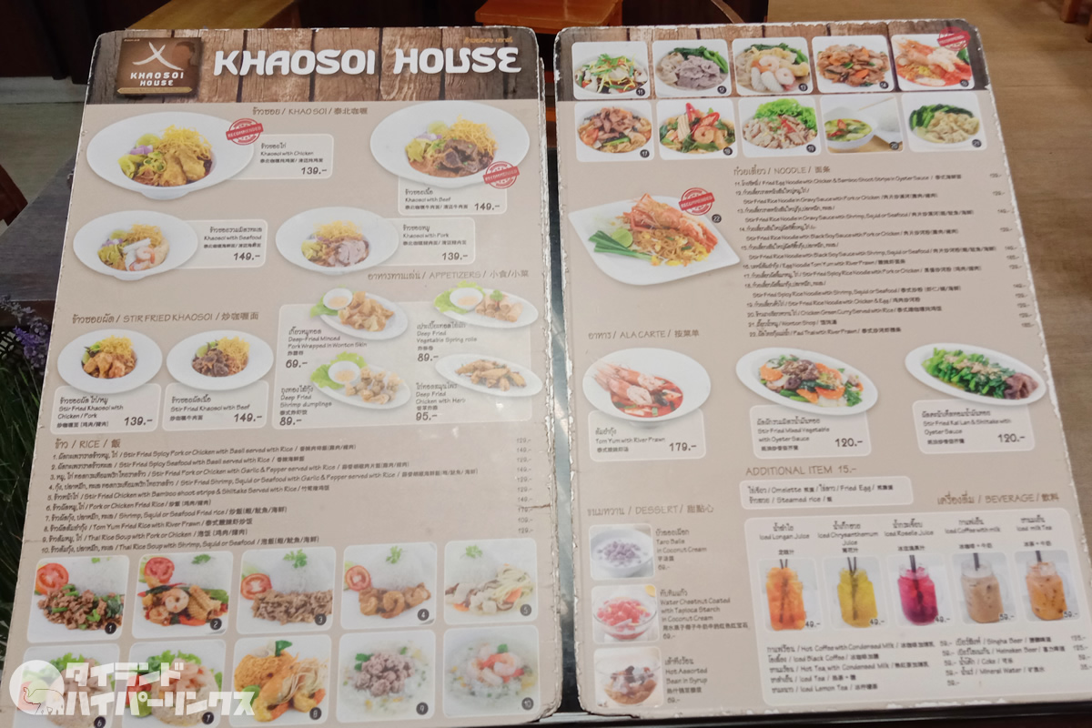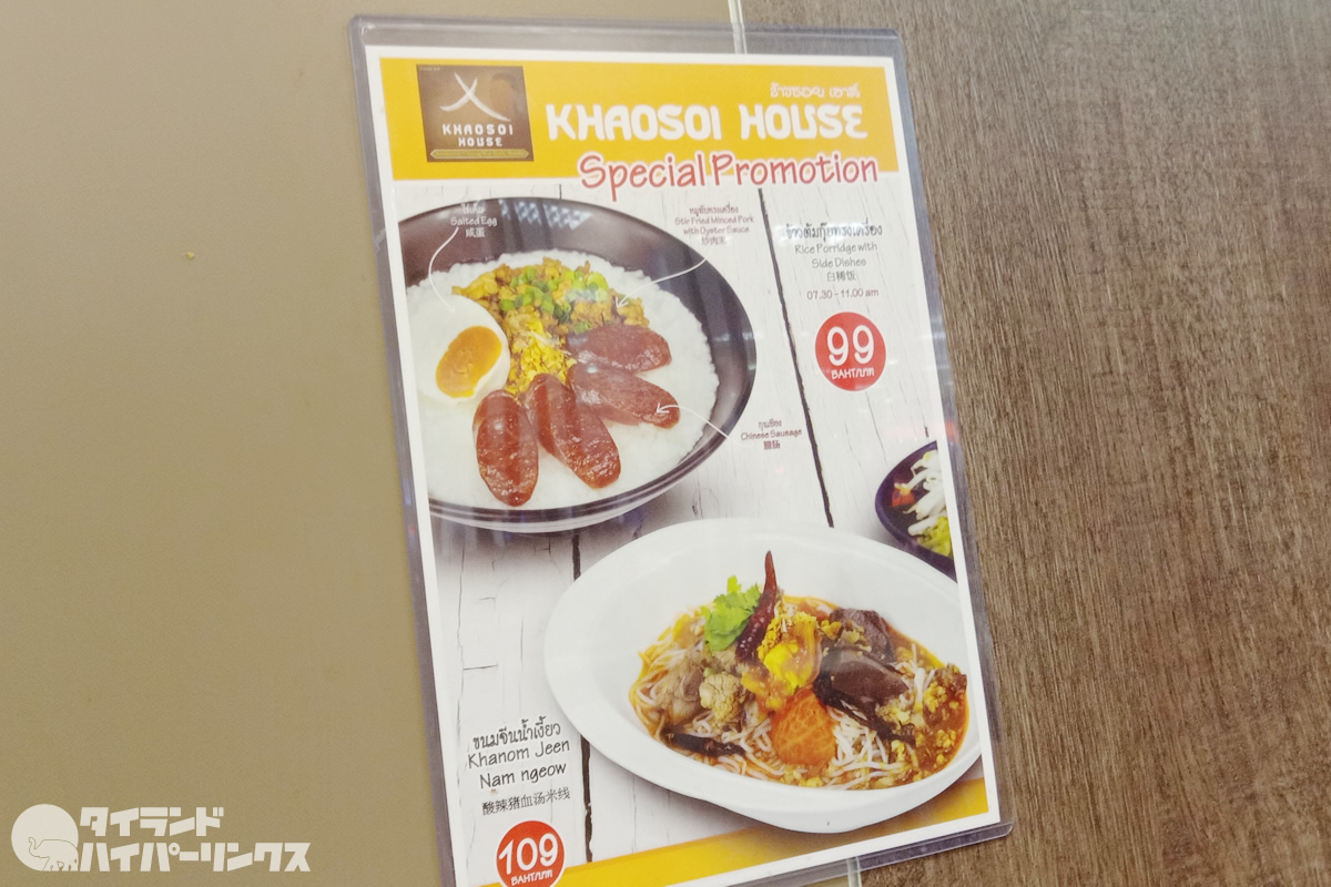 こちらが店頭に置いてあるメニュー。カレーそば「カオソーイ」をはじめ、なかなか充実したメニューです。