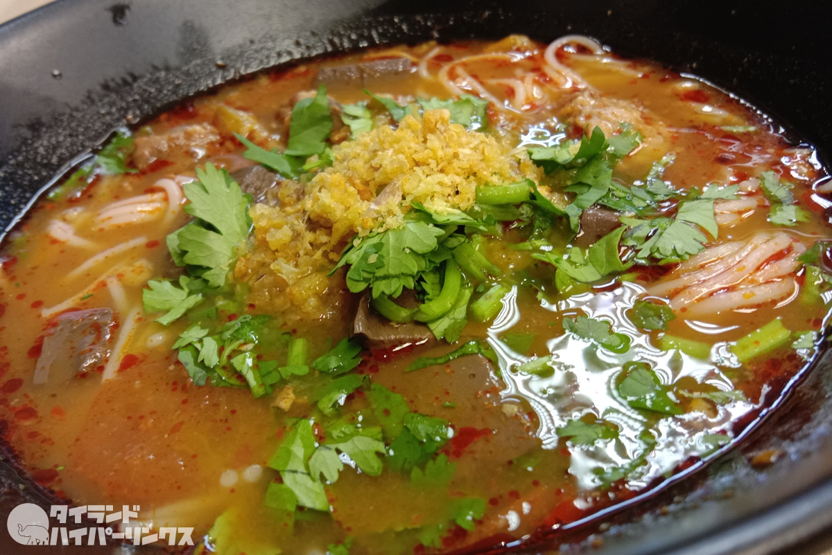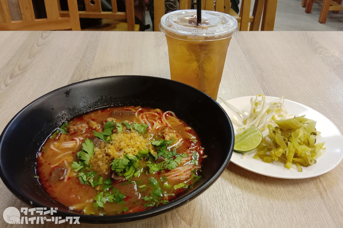 そんな中でオーダーしたのが、壁に貼ってあったスペシャルメニューの「カノムチン・ナムギアオ(ขนมจีนน้ำเงี้ยว)」。この数日間カオソーイばかりでナムギアオは食べていなかったので、これに決定です。
