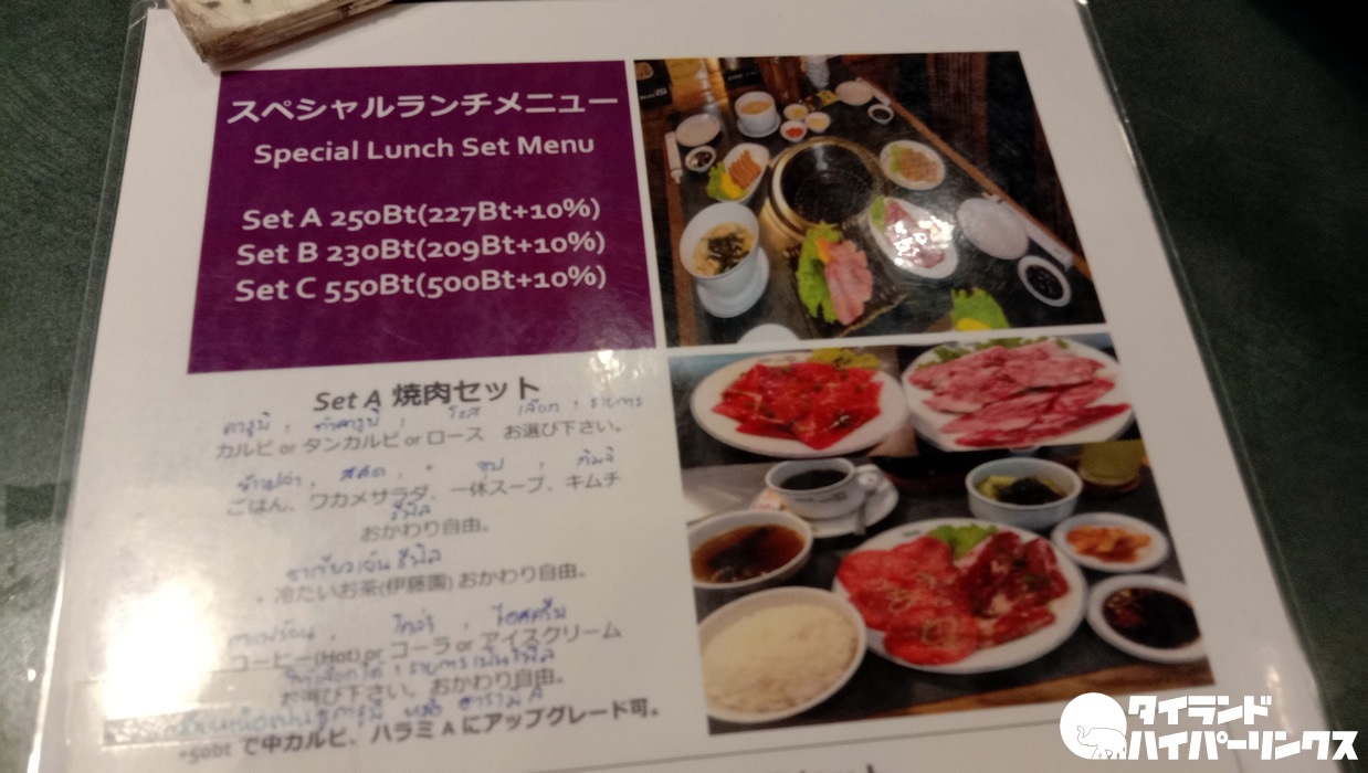 お目当ては、スペシャルランチ。メニューはこちらですが、カルビを選べるセットAは250バーツ。ご飯、スープ、キムチ、お茶はお変わり自由。最後にアイスクリームかコーヒーなども付いてきます。
