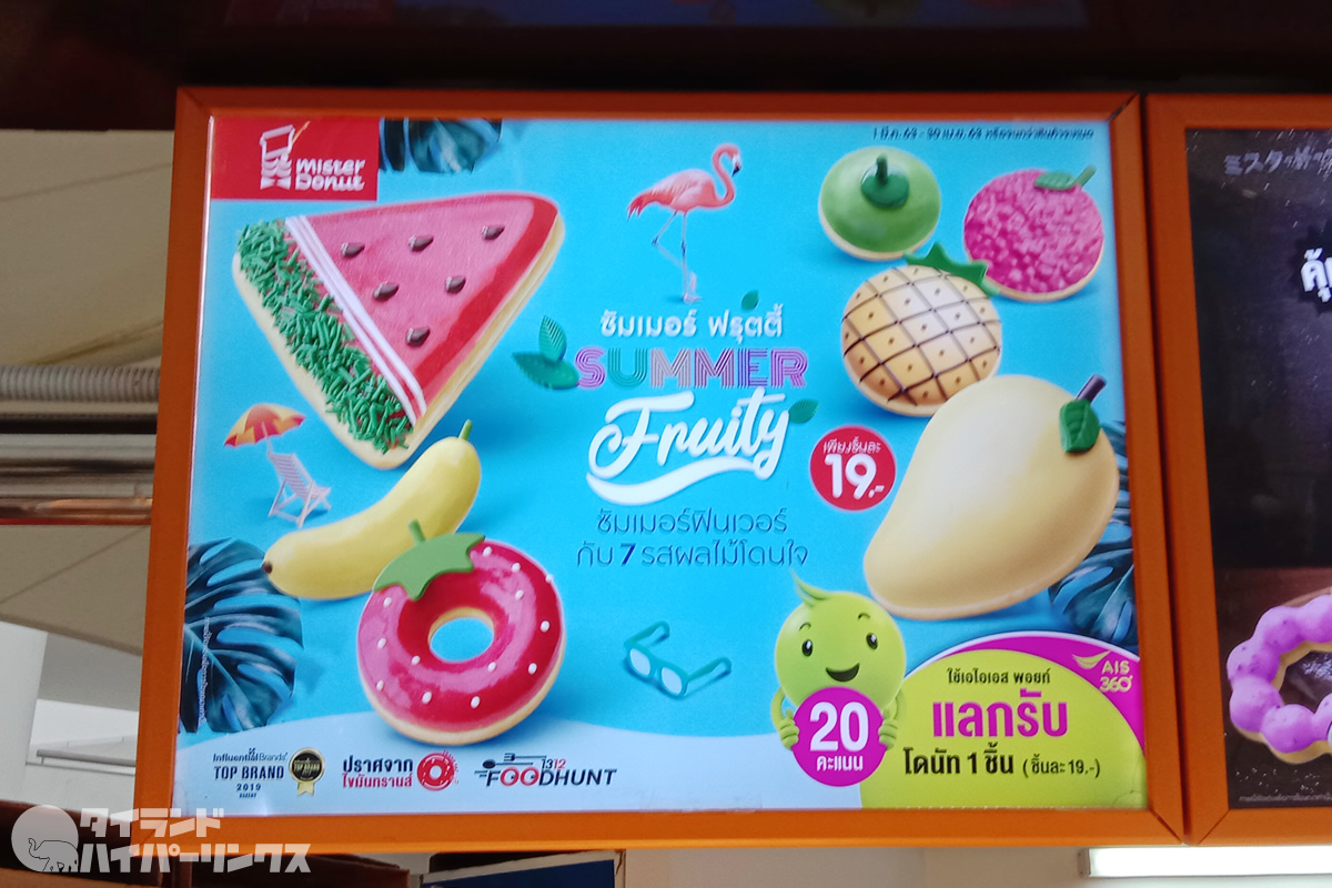 そんな中でキラキラと輝いて見えたのがミスタードーナツの新しいドーナツ「SUMMER Fruity」の広告看板。トロピカルな色とりどりのフルーツがドーナツになりました!