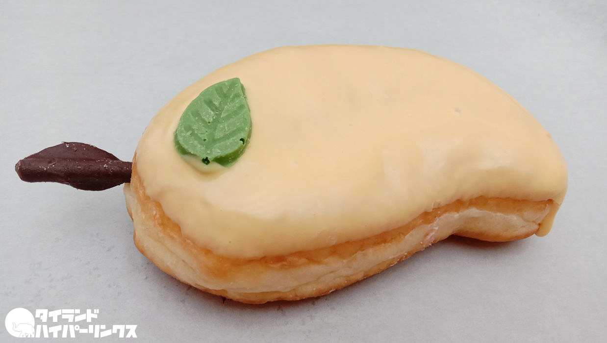 こちらがマンゴーのドーナツ。形はマンゴーそのもの。マンゴー風味のチョコレートでコーティングしてあり、中は普通のチョコレートです。