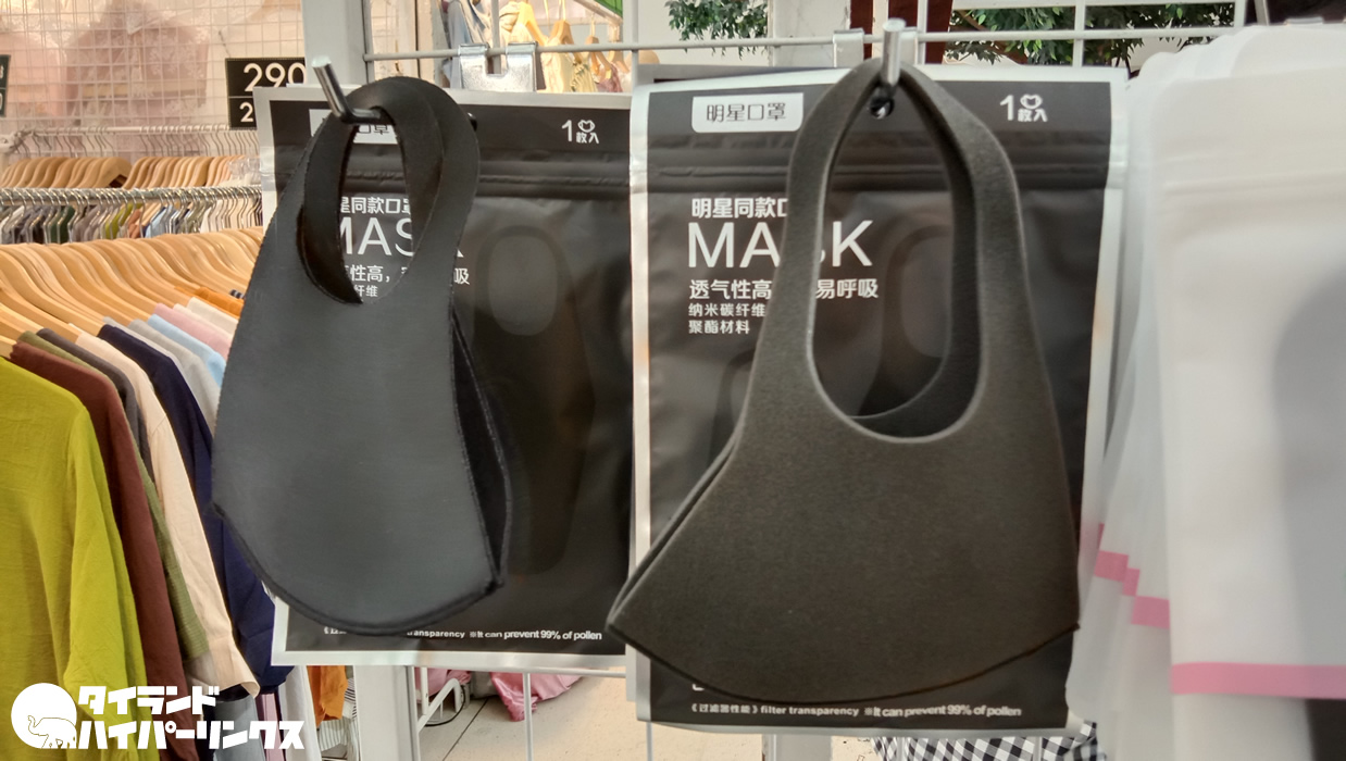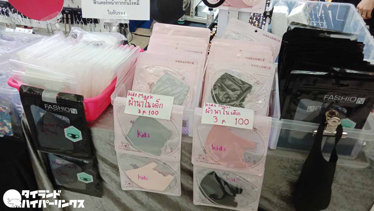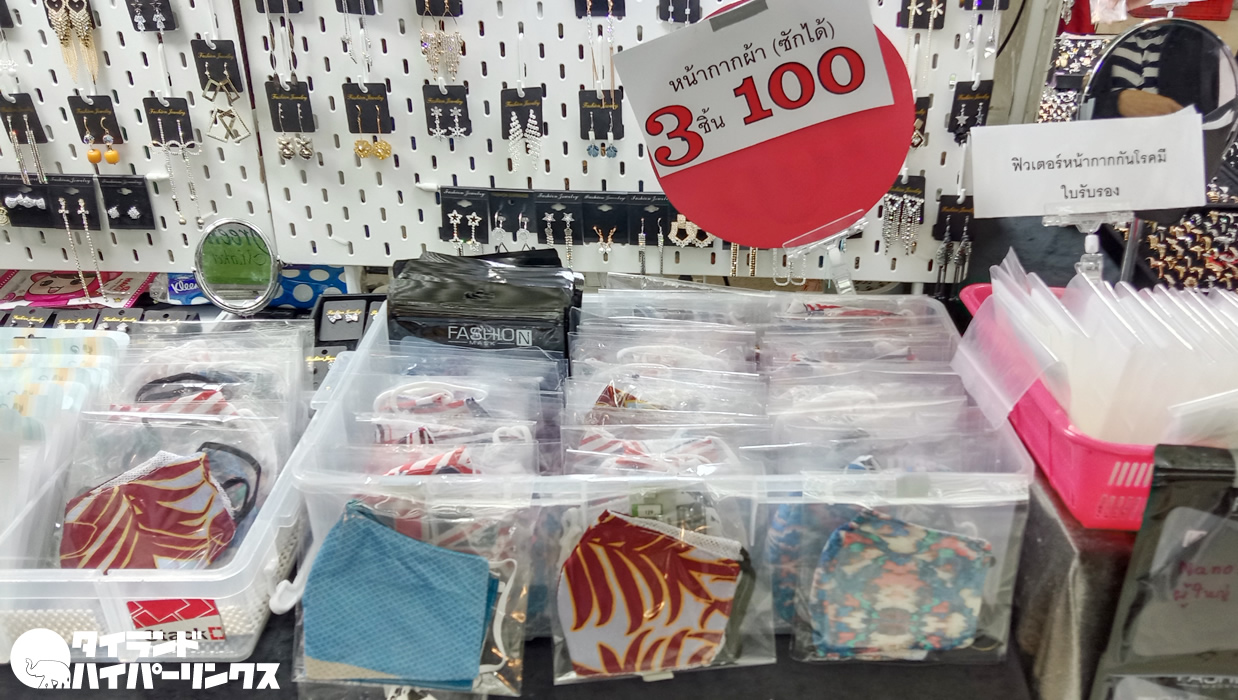 その中には、マスクを売っているお店も多数。使い捨ての紙製でなく、ポリエステルや布などの洗えるタイプのマスクです。今どきはマスクの高額販売は逮捕ですから、価格も安い。この黒いマスクは、1つ50バーツ。