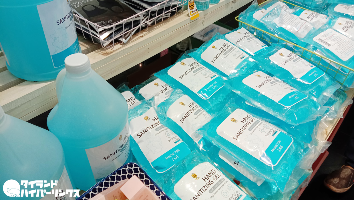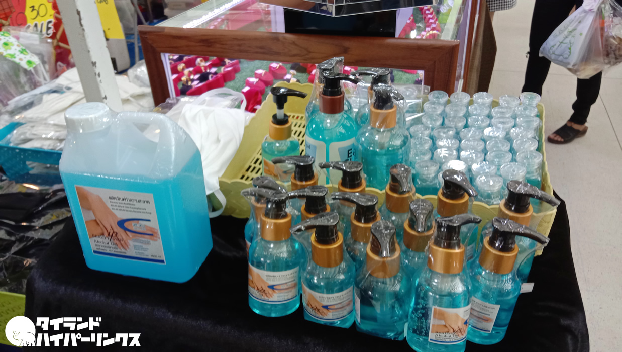 ビニール入りの詰替タイプは390バーツでした。消毒用ジェルは、街のスーパーマーケットなどでも見かけるようになりましたね。一方で液体タイプのアルコールは殆ど見かけません。