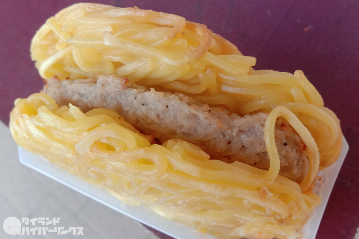 そんなセブンイレブンで見つけた新商品が「ポークチーズラーメンバーガー」(35バーツ)。今どきはご存知の方も多いと思いますが、その名の通りパンズがラーメンで出来ているチーズバーガーです。