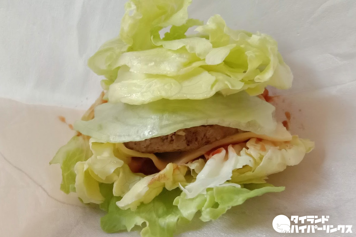 続いてバンズの代わりにタップリのレタスを使ったレタスバーガー。中はチーズとハンバーグなのでそれなりのカロリーなのでしょうが、レタスのおかげでヘルシー感覚。これなら何個食べても太らないのではないかという錯覚に陥ります(笑)。シャキシャキとした食感のレタス最高です!