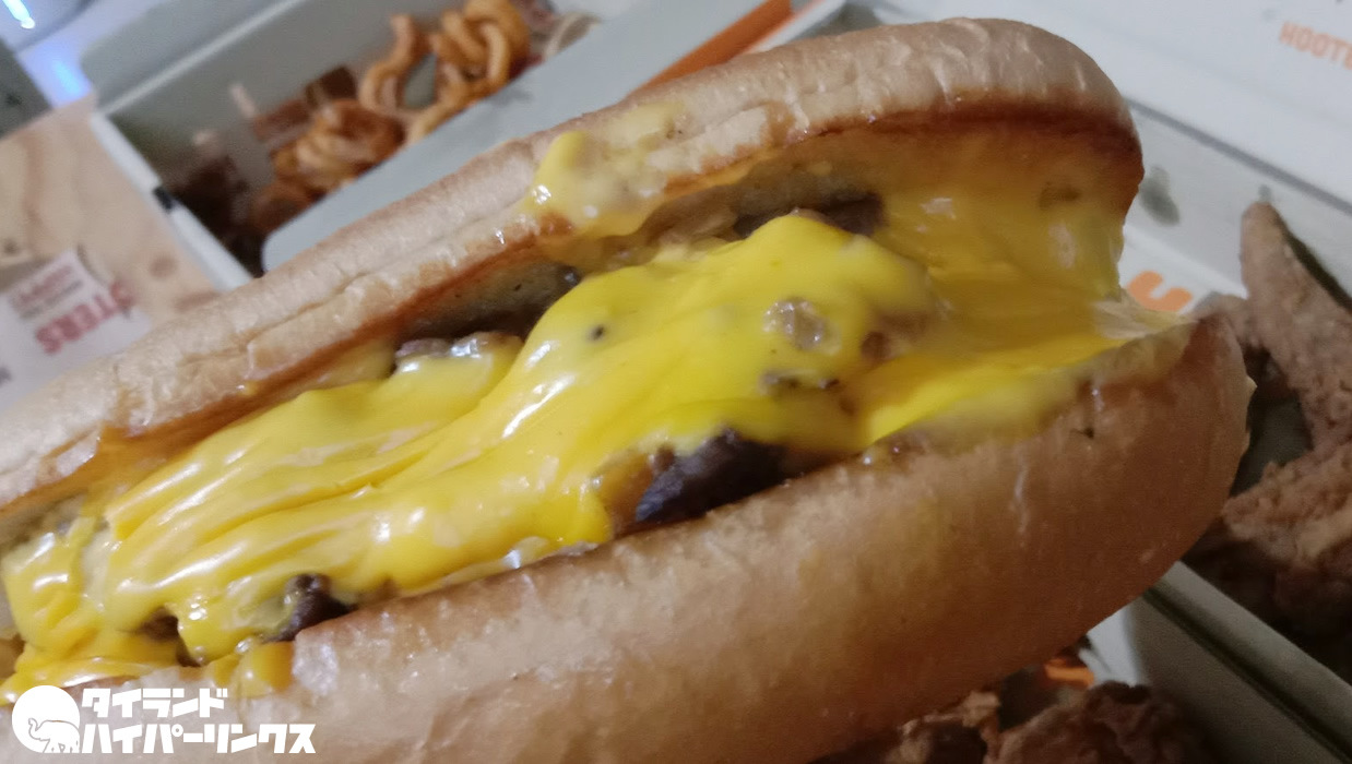 そしてこの日のメインとしてオーダーしたのが「PHILLY CHEESE STEAK SANDWICH」(449バーツ)。パンに薄切りのビーフとグリーンペッパー、オニオン、マッシュルームをはさみ、たっぷりのチーズをかけたボリューム満点の一品。PHILLYというのがペンシルベニア州フィラデルフィアという意味で、フィラデルフィア発の人気のサンドイッチだそうです。いや~、まさに「アメリカを食べている」という感じでした(笑)。もちろんこの日の一番のお気に入りです。それにしても「HOOTERS」のチーズは旨い。